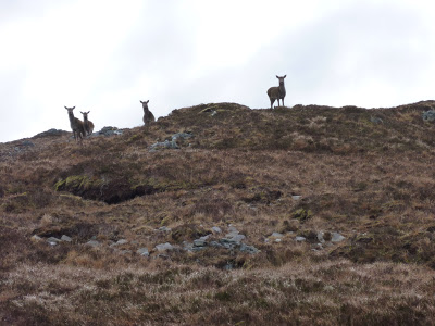 I negotiated my way around most of the boggiest parts, at one point having to do the long jump including tucking knees into chest and leaning forward when I realised I was going to fall short (made it). This is where poles come into their own using them like a pole vault. While I was doing this I noticed I was being watched by a heard of deer. Luckily the boggy section between the road to the foot of Suilven is less than a mile.