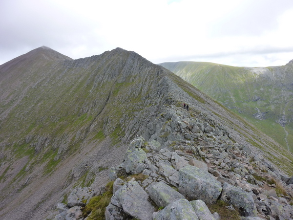 The airy arete was over far too soon, I did contemplate walking walking back along again but decided I still had some steep ascent to the summit of the Ben. The views across to the Ring of Steall route I walked the day before were simply superb, the sight of the Mamores had me making mental notes to add them to my next TGO Challenge crossing. Peering down from the abseil posts which looked quite tame today, I could see people below. Onwards and upwards...