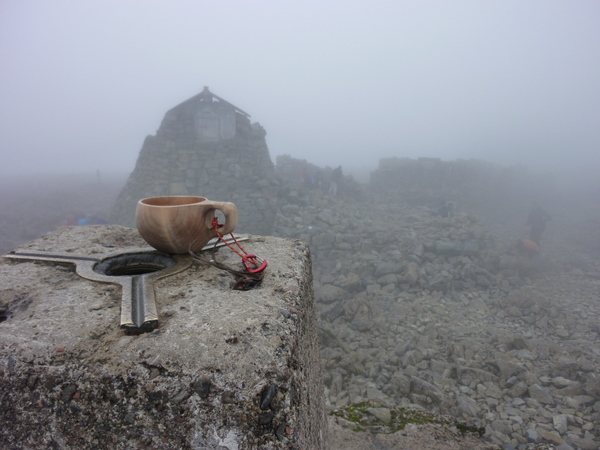 Almost immediately after leaving the abseil post sign I walked into a wall of cloud. The route kept disappearing or rather I kept loosing it in the low visibility. This reminded me of the first time I was on Ben Nevis and you can feel slightly disorientated. Eventually the route flattened and I knew it wasn't far to the summit, I could now see several cairns which turned out were marking the edge of the drop, luckily I checked the direction I should be heading and didn't blindly head towards the cairns. This felt a bit strange, the cairns which remain on the tourist route up are the ones you should follow, this side they were at the edge of a rather large drop. Anyway a few minutes later and groups of people could be heard then seen. The summit of Britain was once again reached, again Kuksa pictures at the top were taken and while eating my lunch I realised the actual highest point would be the roof of the shelter. The thought did cross my mind to put the Kuksa on the roof, but decided against it.